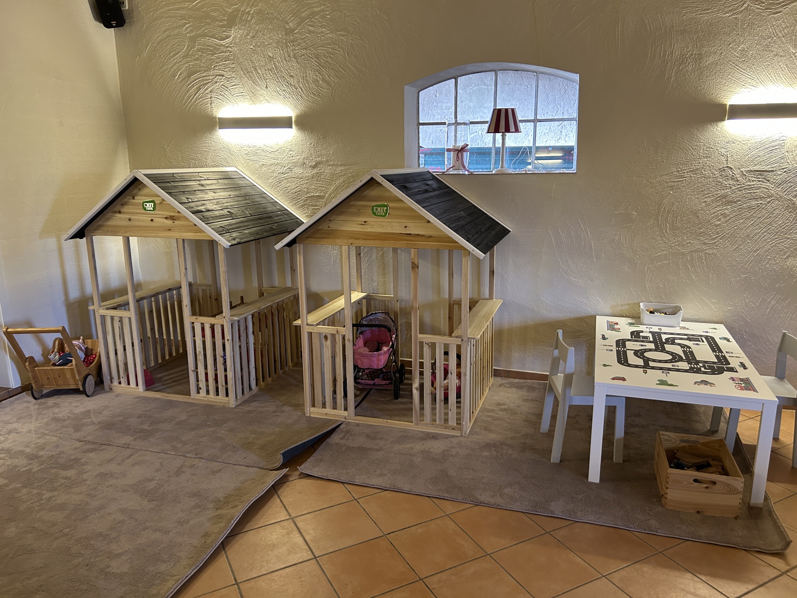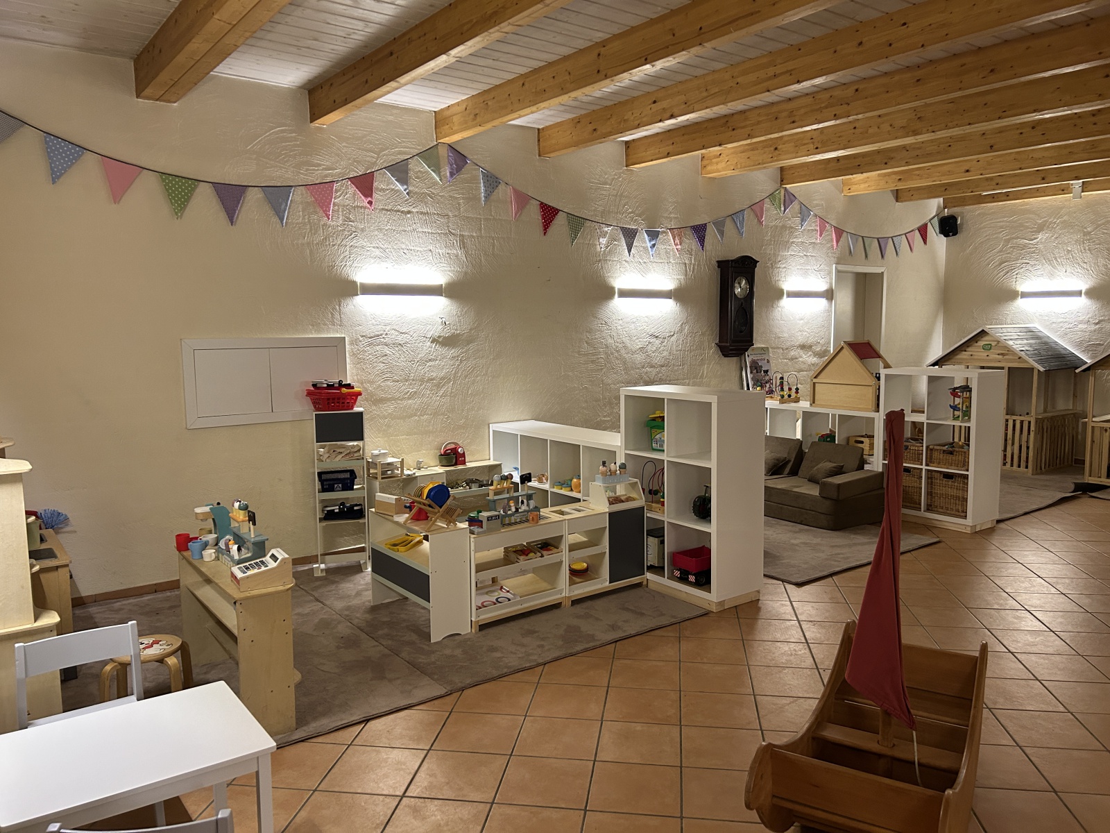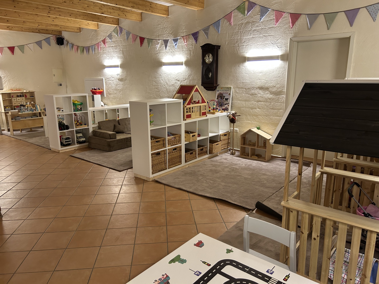 Auf ca. 150 qm erwarten Euch viele tolle Spielmöglichkeiten. Von Kaufmannsladen, Spielcafé, Puppenhäuser, Spieleisenbahn- und Spielstraßentisch, Tobecouch, Leseecke über Kick-Fußball bis Billard, hier findet jeder sein Spielplatz! Unsere Spielscheune ist täglich von 8 bis 21 Uhr für unsere Feriengäste geöffnet.